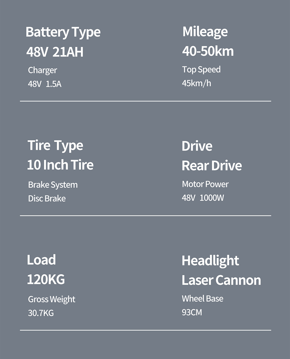 Adotta un motore ad alta potenza per fornire un'esperienza di guida stabile, una forte potenza, la velocità massima di guida può raggiungere i 55km/h, è possibile guidare liberamente all'aperto, godendo della nuova esperienza di guida.