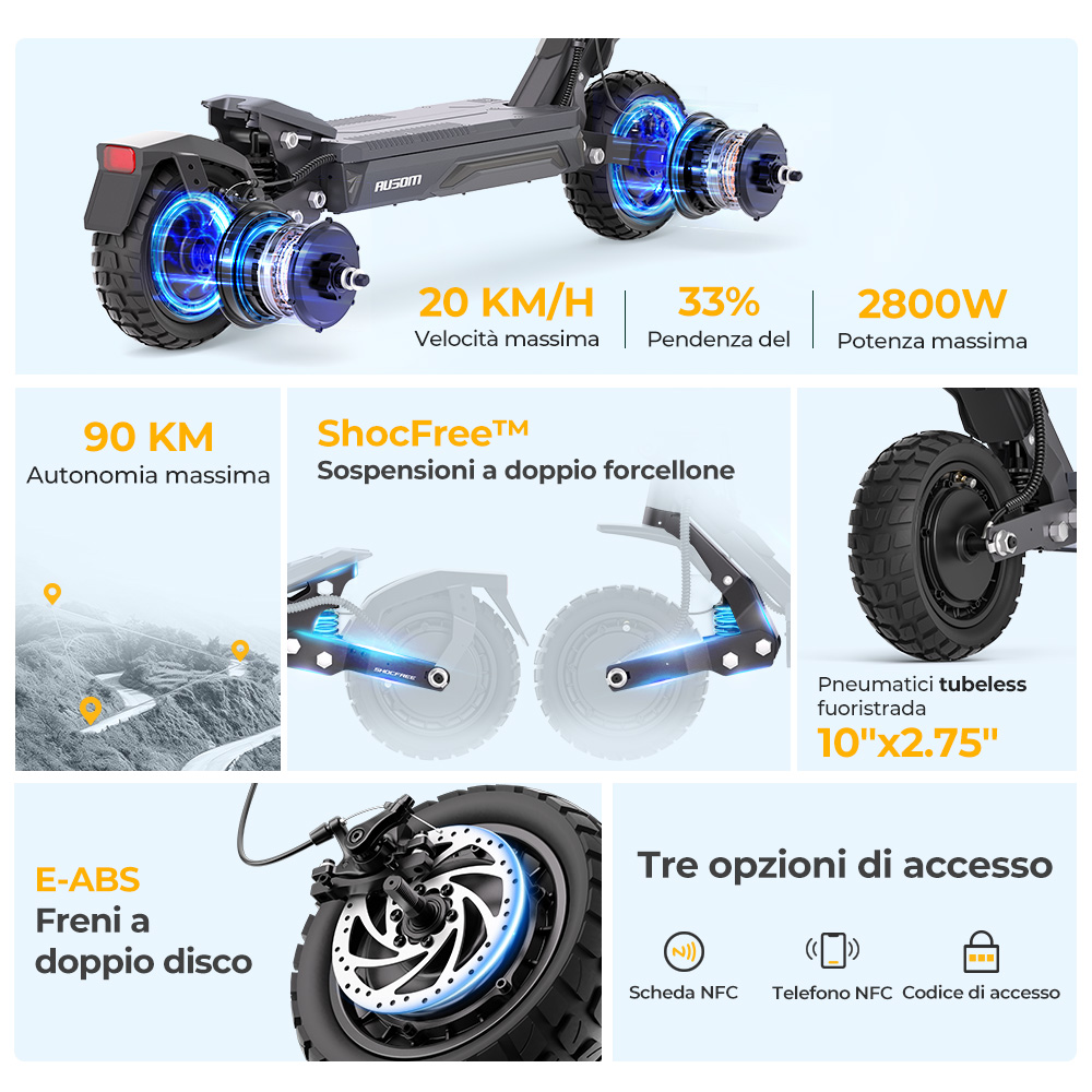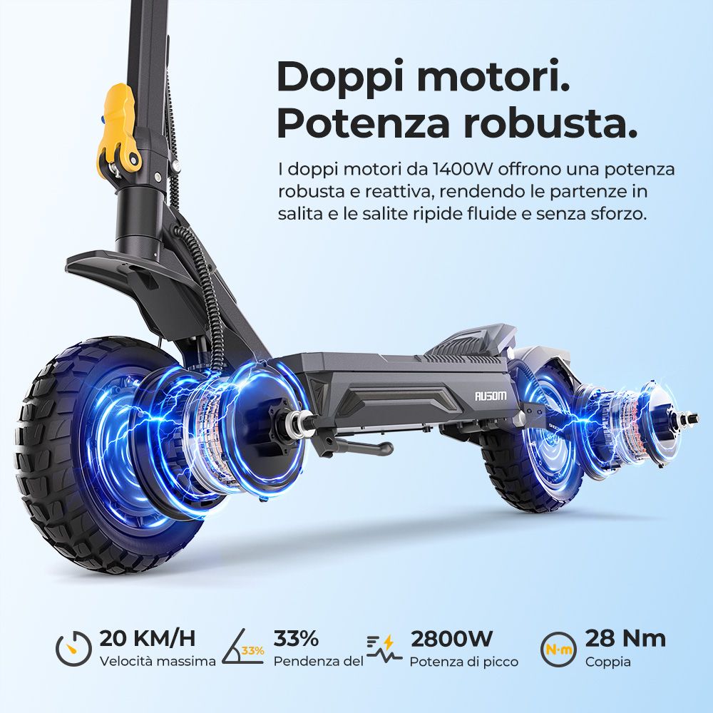 I doppi motori da 1100 W supportano una velocità massima di 68 km/h e hanno una coppia elevata per superare facilmente le pendenze.