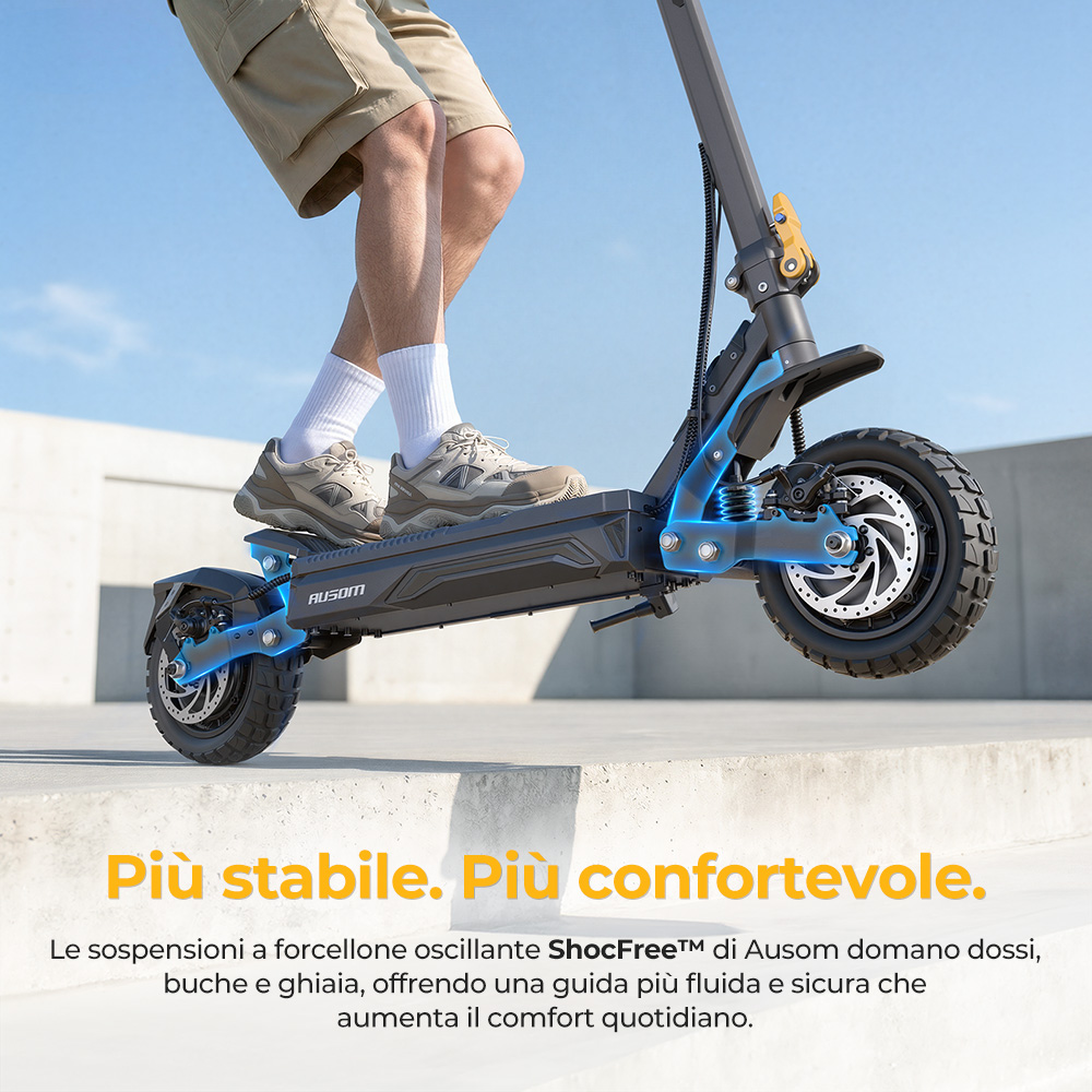 È progettato con un esclusivo sistema di sospensione ShocFree con braccio oscillante, che filtra efficacemente urti e vibrazioni della strada. Mantiene stabilità e controllo su buche, dossi, strade sterrate e in curva, offrendo una guida più fluida rispetto ai tradizionali monopattini da città.