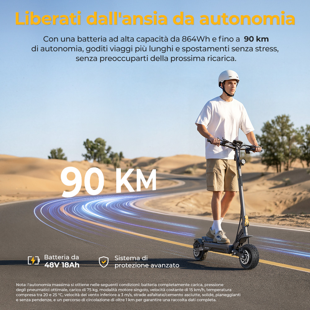 I doppi motori da 1400W forniscono una potenza di picco totale di 2800W, mentre la batteria 48V 18Ah offre fino a 90 km di autonomia con una singola carica.
