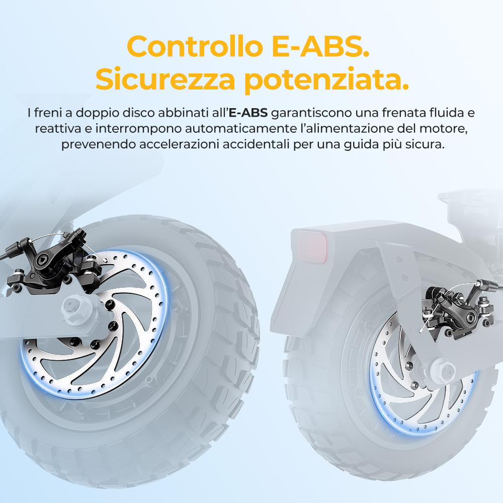 Il Gosoul 2 Pro integra freni a disco anteriori e posteriori con tecnologia avanzata E-ABS, per garantire una frenata pronta e ben bilanciata. Questo sistema coordinato riduce il rischio di bloccaggio delle ruote e aiuta a mantenere la stabilità dello sterzo, migliorando la sicurezza.