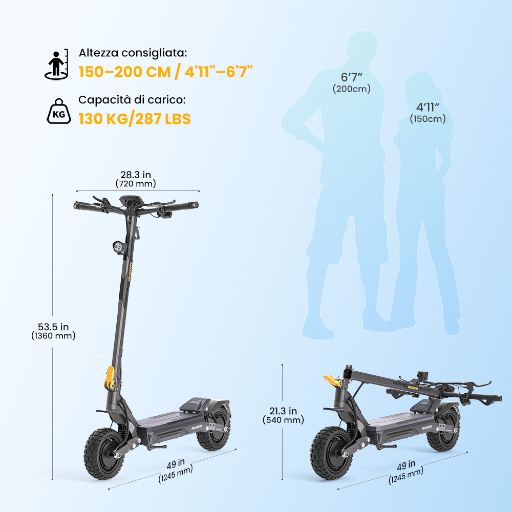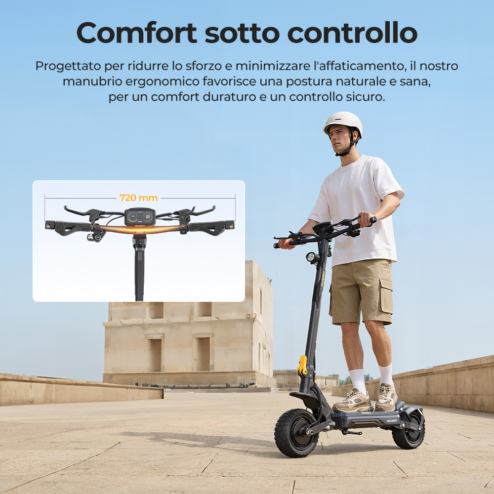È dotato di un manubrio ergonomico che favorisce una posizione di guida naturale, riducendo l’affaticamento di braccia e polsi sulle lunghe distanze. La pedana ampia ed estesa (520 × 185 mm) offre più spazio per i piedi e una migliore distribuzione del peso, migliorando comfort, stabilità e controllo. Il design pieghevole consente di riporlo facilmente in garage, nel bagagliaio o in spazi ridotti, rendendo semplice il trasporto e lo stoccaggio — perfetto per le tue avventure all’aperto.
