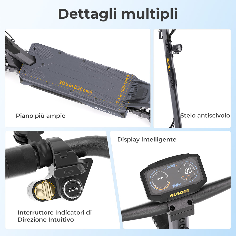 Dotato di due motori da 1400W che erogano una potenza di picco combinata di 2800W e 28 Nm di coppia, l’Ausom Gosoul 2 Pro offre un’accelerazione potente e reattiva. Raggiunge una velocità fino a 20 km/h e affronta pendenze fino al 33%, mentre le tre modalità di velocità (10 / 15 / 20 km/h) consentono di adattare la guida alle diverse esigenze. Con una capacità di carico di 130 kg (287 lbs), garantisce potenza e stabilità sia in salita sia durante gli spostamenti quotidiani, permettendo di trasportare comodamente il conducente e gli oggetti necessari.