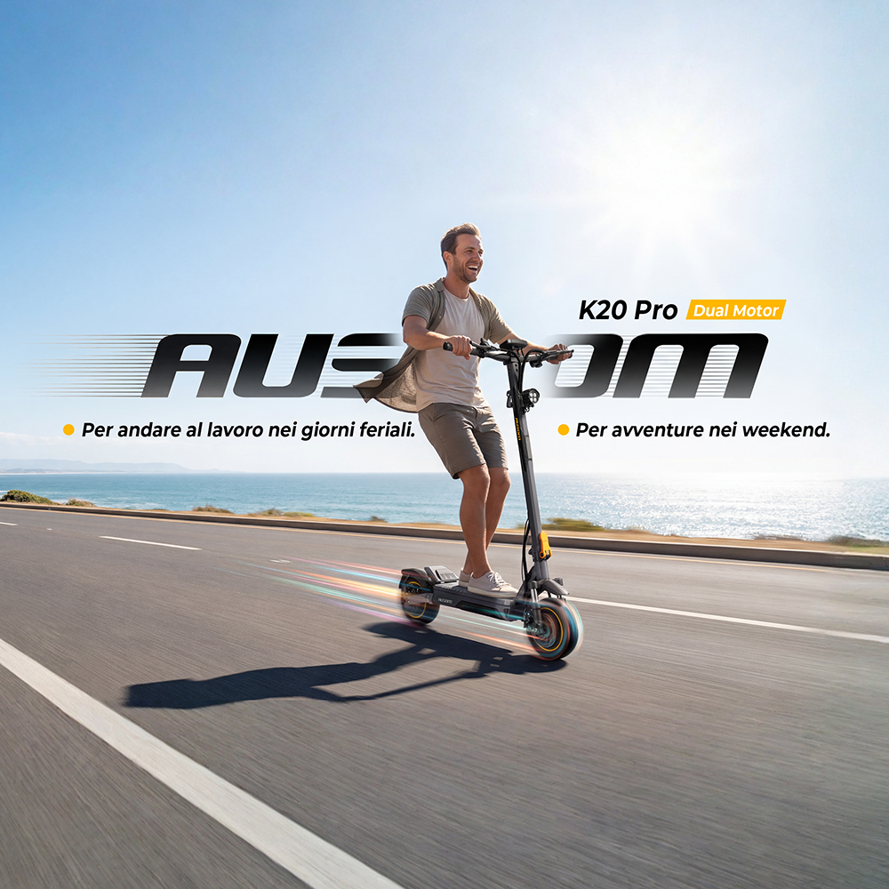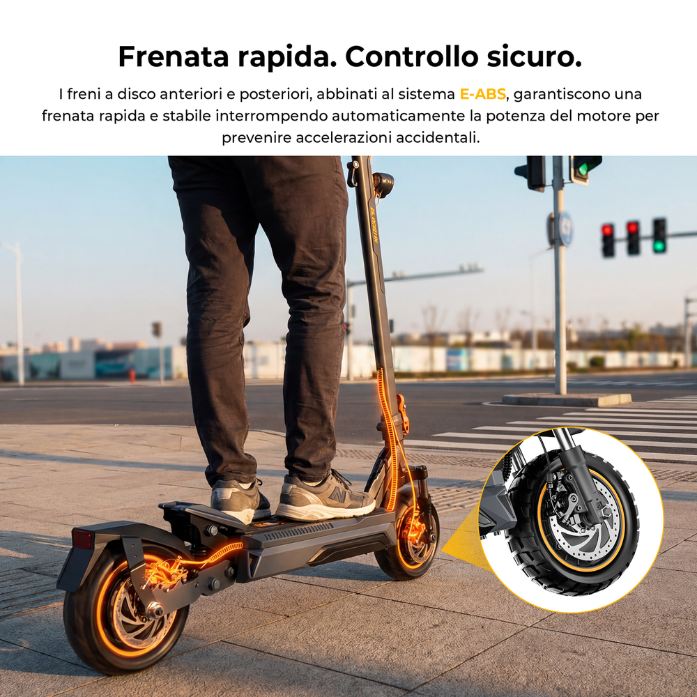 Il K20 Pro combina freni a disco anteriori e posteriori con tecnologia avanzata E-ABS per garantire una frenata pronta ed efficace. Questo sistema integrato riduce il rischio di bloccaggio delle ruote e mantiene stabile lo sterzo durante la decelerazione, migliorando la sicurezza nelle condizioni di guida quotidiane.