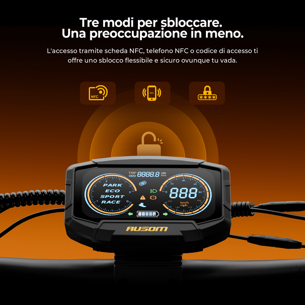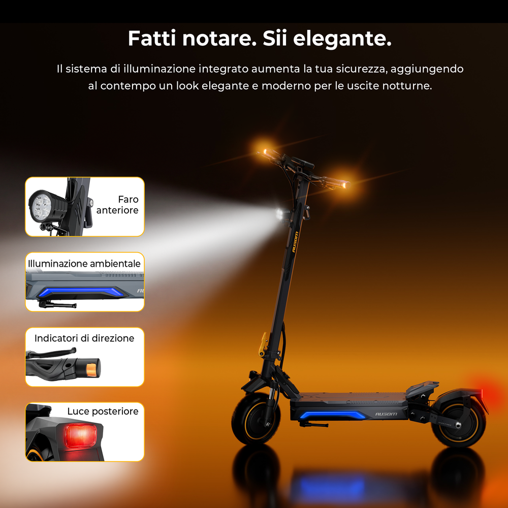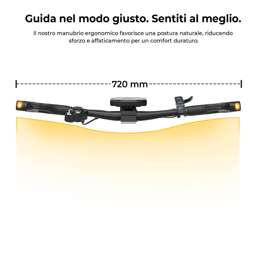 Il sistema di sicurezza senza chiave doppio, con NFC e codice di accesso, permette uno sblocco rapido e sicuro con protezione antifurto per l’uso quotidiano. Con certificazione IP54, offre prestazioni affidabili anche sotto la pioggia e in condizioni atmosferiche difficili. Il sistema di illuminazione completo, con faro anteriore luminoso, luce posteriore, indicatori di direzione e luci ambientali, garantisce ottima visibilità in condizioni di scarsa illuminazione e conferisce al monopattino un aspetto moderno e premium.
