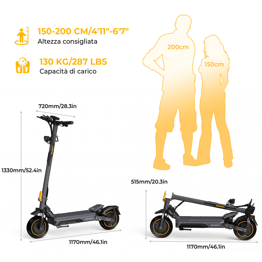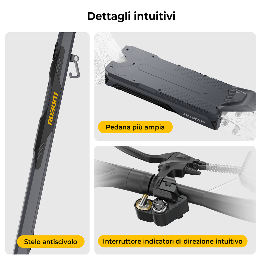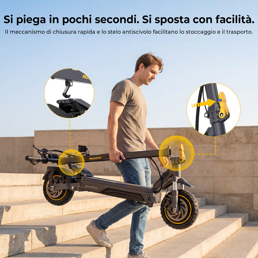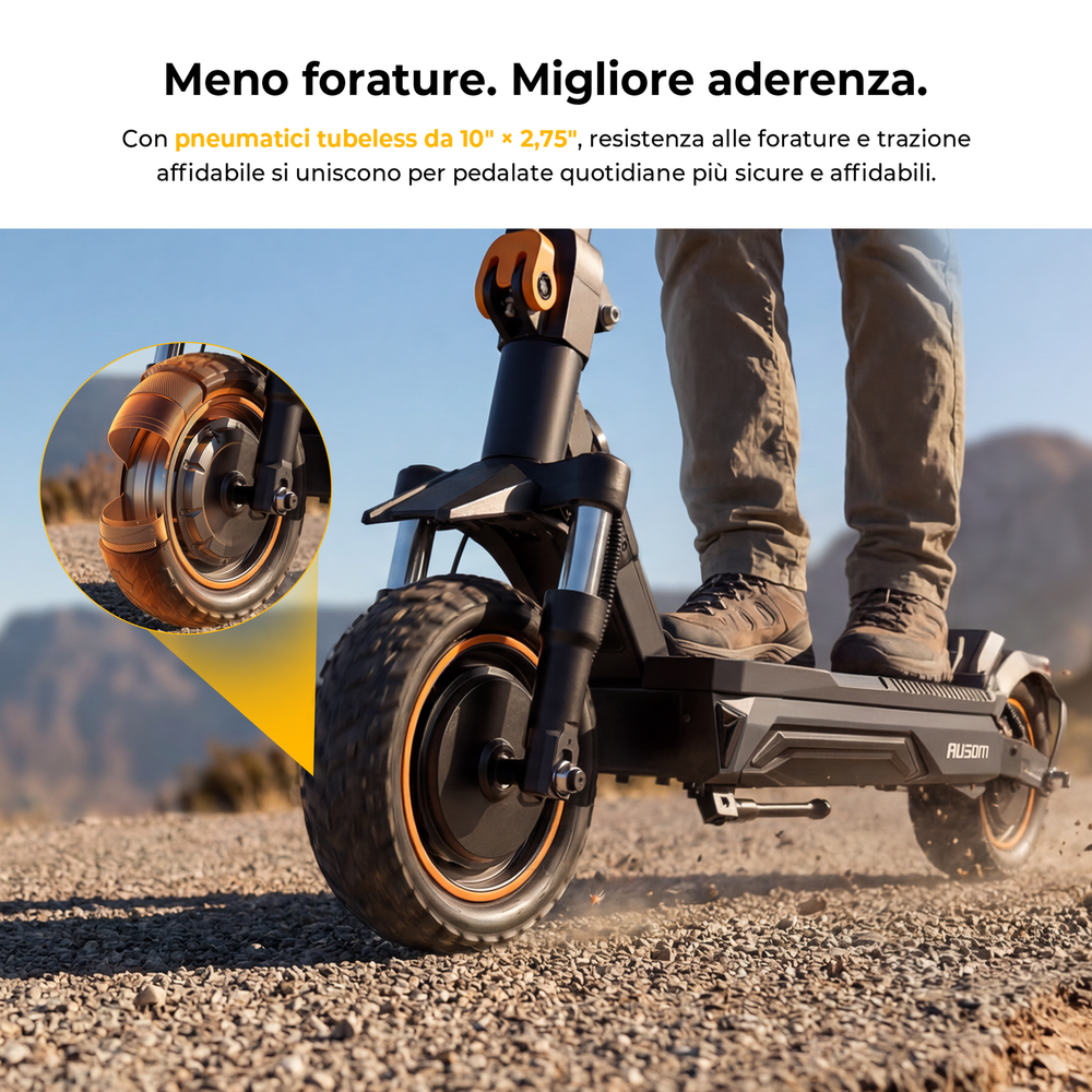 Pneumatici da 10 pollici + ammortizzatori anteriori e posteriori per un'esperienza di guida più confortevole.