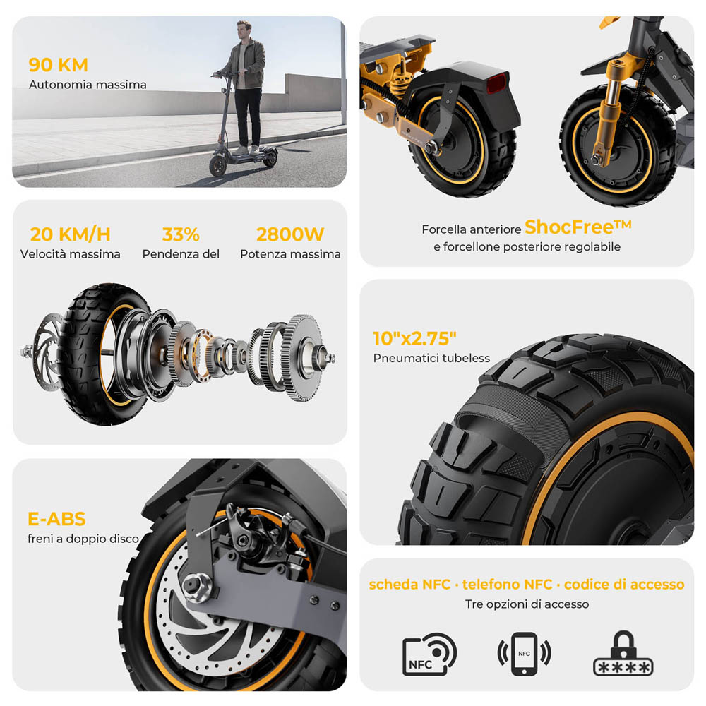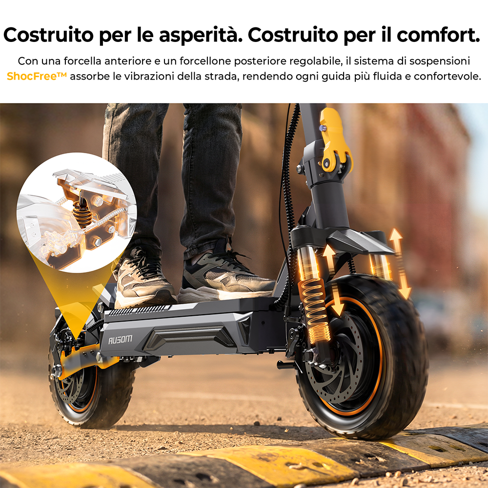 La forcella con sospensione anteriore e il forcellone posteriore ShocFree regolabile a doppio lato assorbono efficacemente urti e vibrazioni della strada, migliorando il comfort anche durante l’uso prolungato. Abbinato a pneumatici tubeless resistenti da 10" × 2.5", garantisce trazione affidabile e resistenza alle forature, assicurando una guida fluida e controllata su ghiaia, asfalto irregolare e terreni misti.