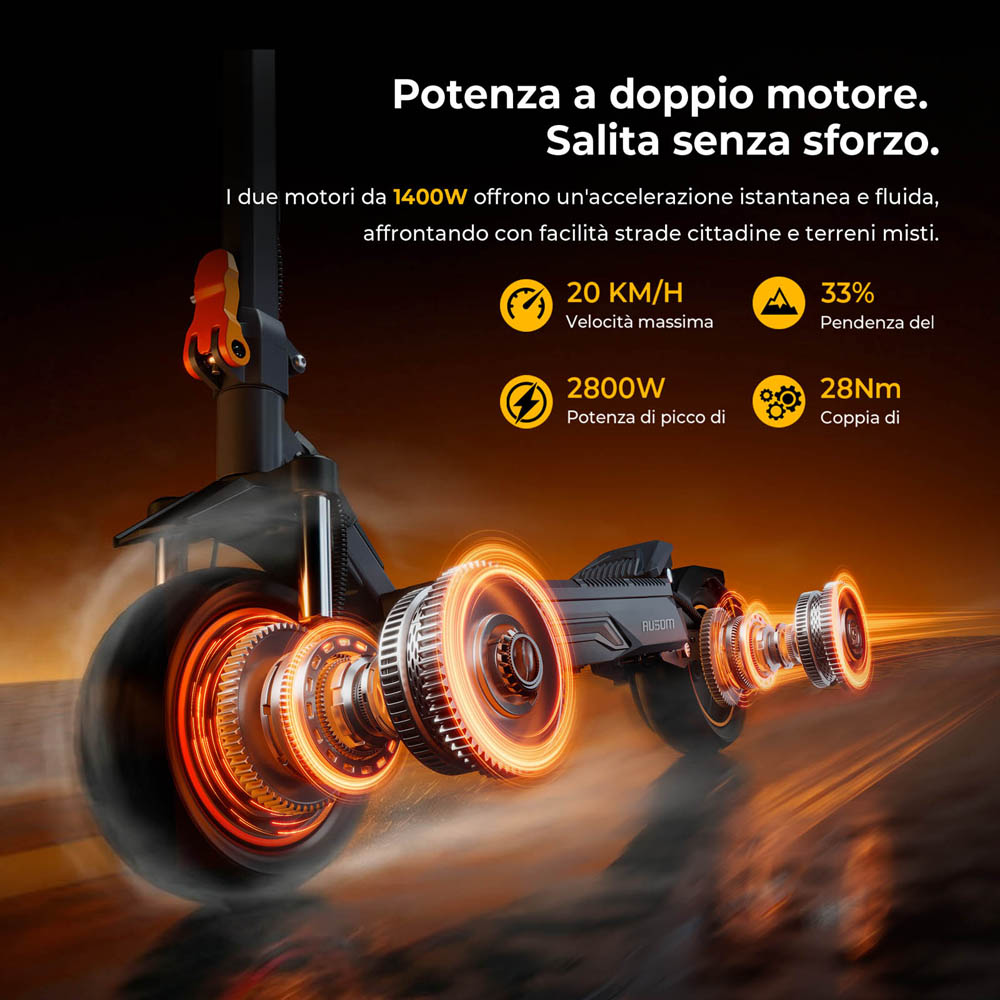 I doppi motori da 1100 W supportano una velocità massima di 68 km/h e hanno una coppia elevata per superare facilmente le pendenze.
