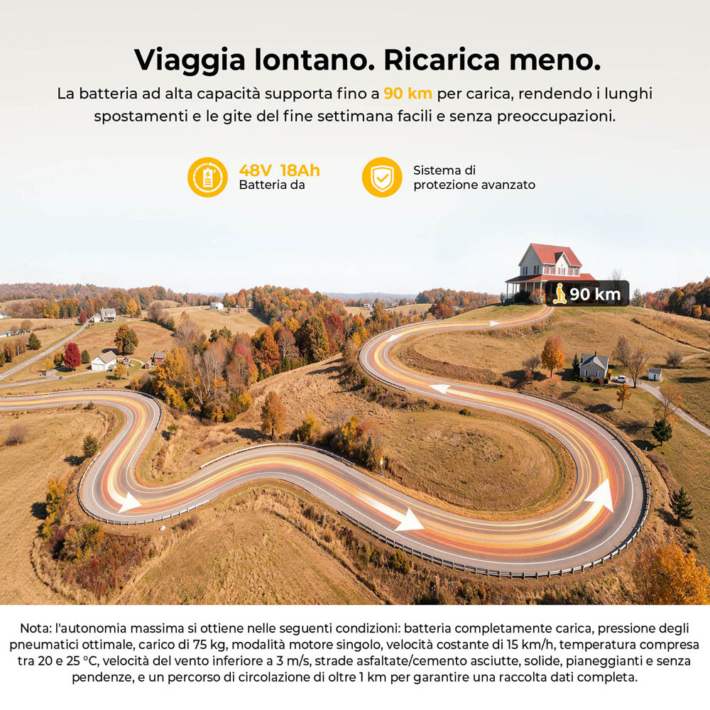 La batteria 48V 18Ah offre un’autonomia fino a 90 km, ideale sia per gli spostamenti quotidiani sia per tragitti più lunghi.